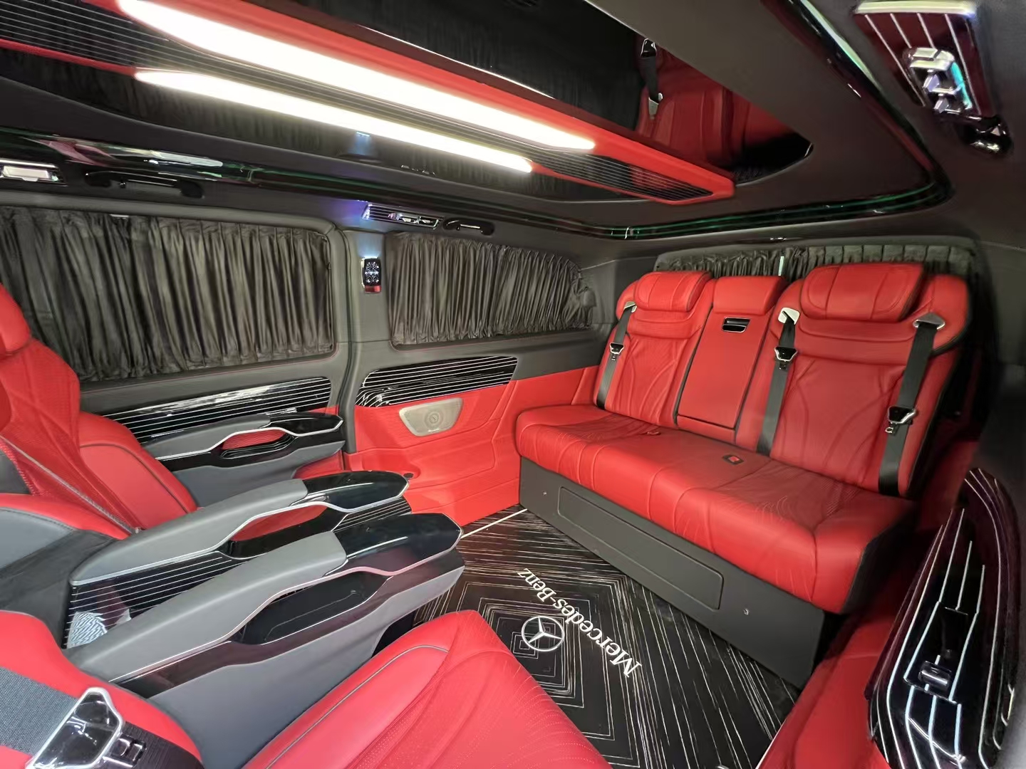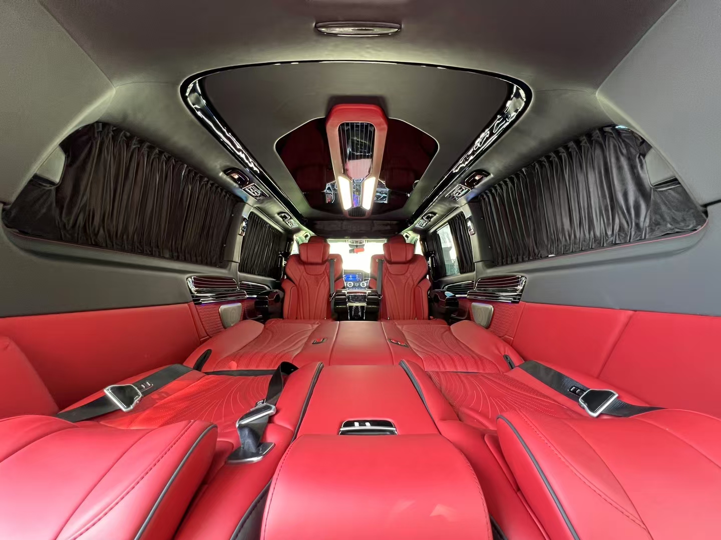 Even in the third row of the Mercedes-Benz V260L modified 6-seat business vehicle, passengers can enjoy an ergonomically designed, adaptable journey of comfort. The rear seats feature electrically adjustable cushions that slide forward and backward, while the entire backrest reclines to achieve a fully reclined position. The rear three seats feature an electric three-seat sofa configuration with one-touch recline functionality, transforming into a full-size bed in just one second. To accommodate family-oriented usage, the rear cabin prioritizes practicality over the complete privacy of a full partition design. Instead, the V260 incorporates electric blackout curtains, ensuring the interior remains discreet from outside view. This model features swiveling rear dual seats, enabling the rear cabin to swiftly transform into a business negotiation configuration. That concludes Brother Xiao Feng's introduction to this Mercedes-Benz V260L custom seven-seat business vehicle.